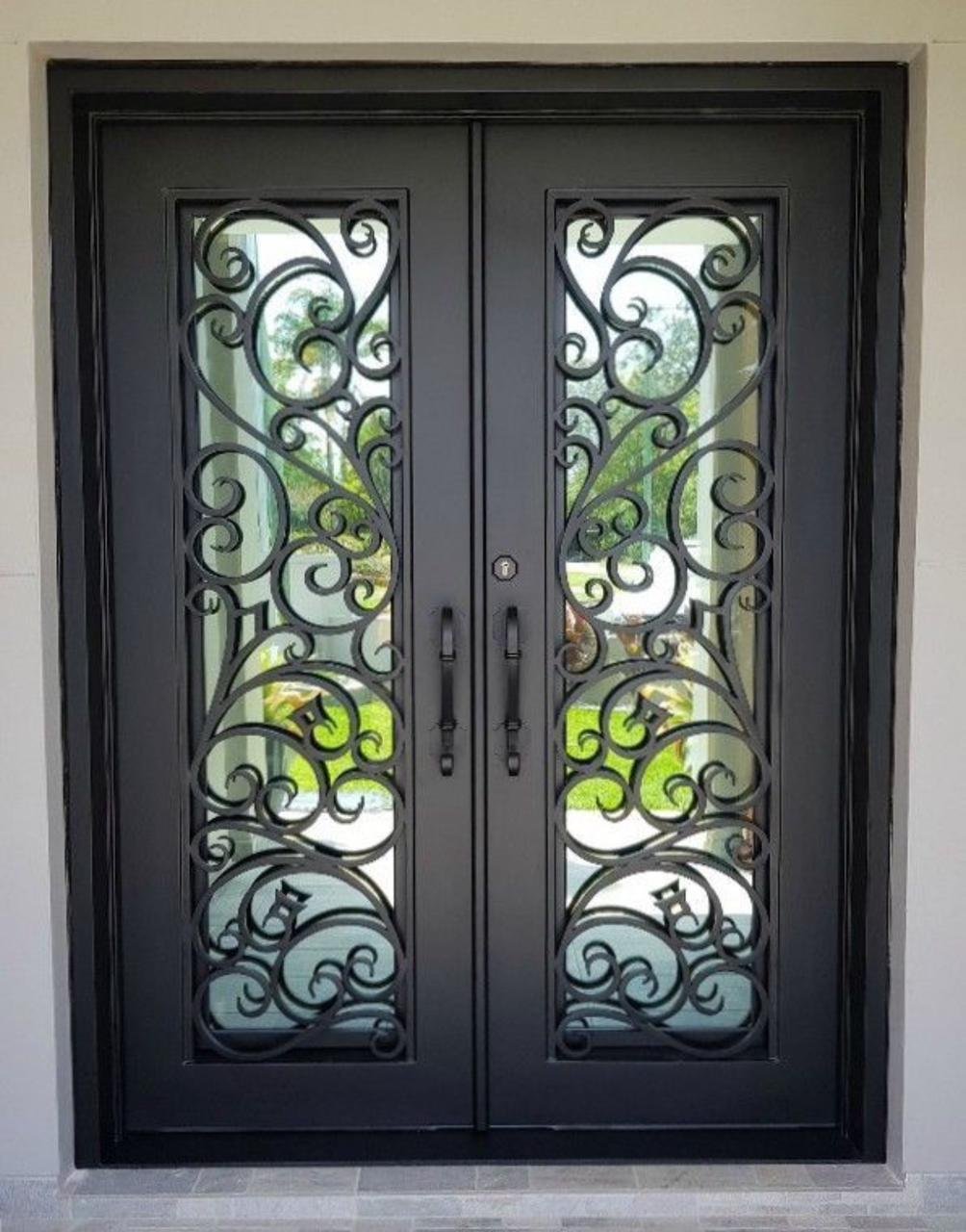 باب حديد فريم عريض دبل صاج سمك 2 مم مع ديكور بالوسط مشغول مليان 16 مم مع خلفية زجاج اولكسان